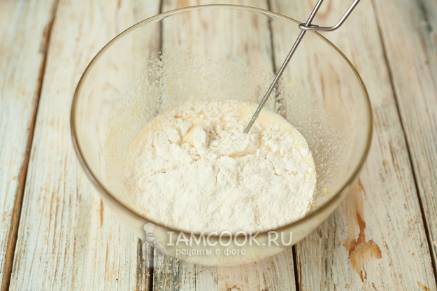 Муку перемешайте с разрыхлителем и частями добавьте в миску со взбитыми яйцами. Добавьте сначала примерно треть, аккуратно перемешайте, добавьте еще треть и т.д.
