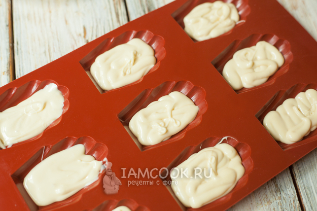 Формы для «Мадлен» вымойте и высушите. В каждую ячейку влейте примерно по 10 г шоколада.