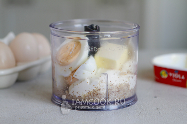 В чашу блендера добавьте плавленый сыр (лучше выбирать без добавок), яйца и кусочек сливочного масла комнатной температуры.