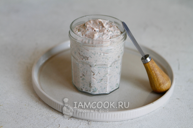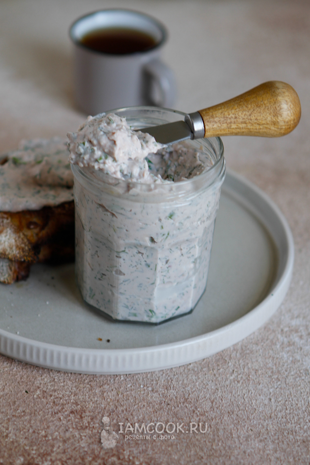 Попробуйте на вкус и при необходимости добавьте специи: соль или любимые травы. Переложите намазку в банку, закройте крышкой банку и уберите ее в холодильник на 30 минут.