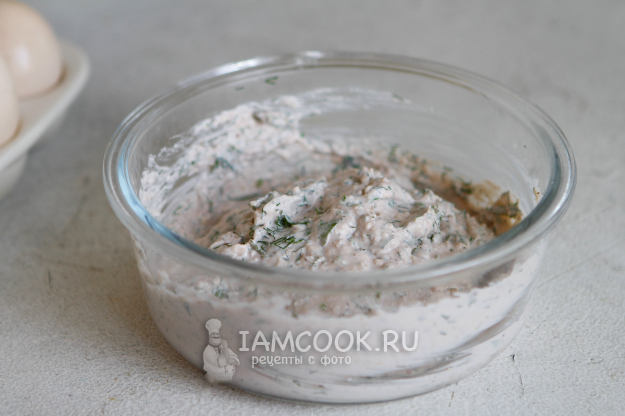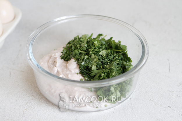Зелень заранее замочите, обсушите, мелко нашинкуйте и вмешайте в полученную массу.