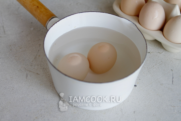 Для начала необходимо отварить яйца вкрутую. Яйца переложите в сотейник, влейте воду и отправьте на плиту. Как только закипит вода, посолите воду. Убавьте огонь и варите яйца 7-10 минут. Далее остудите яйца в холодной воде и почистите.