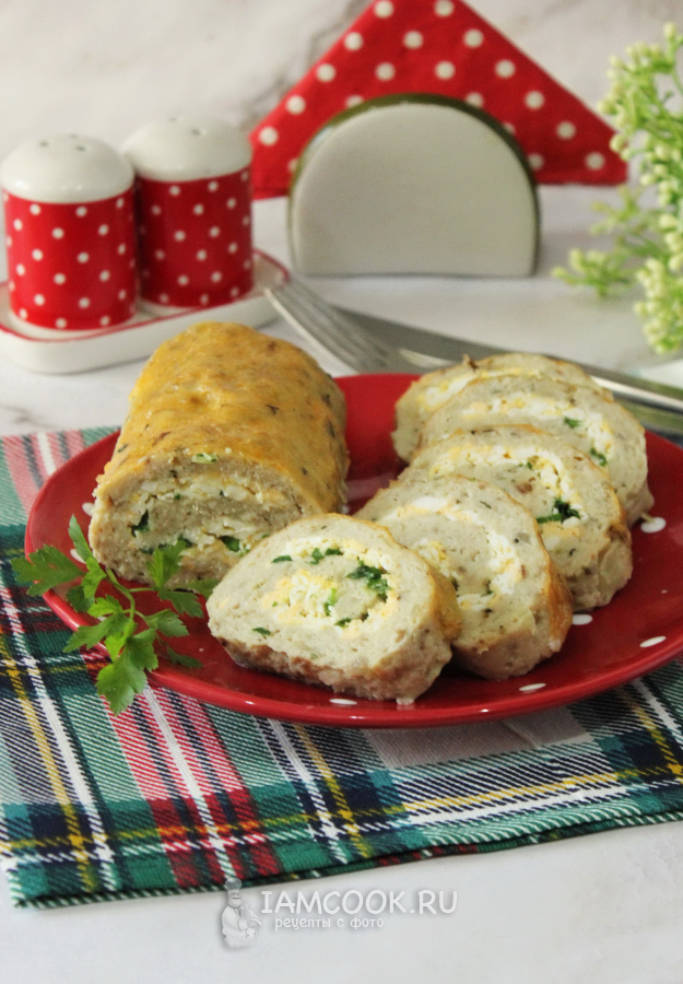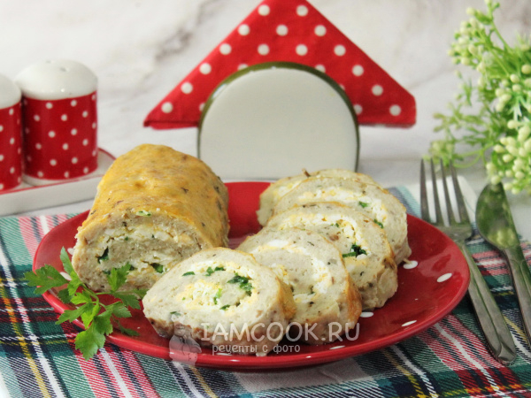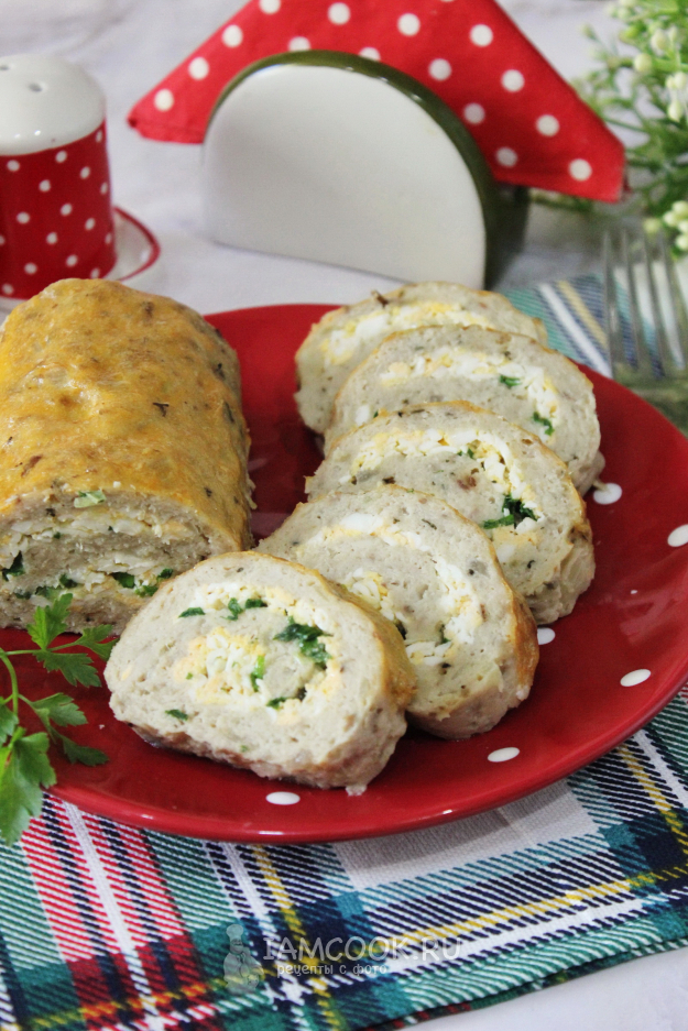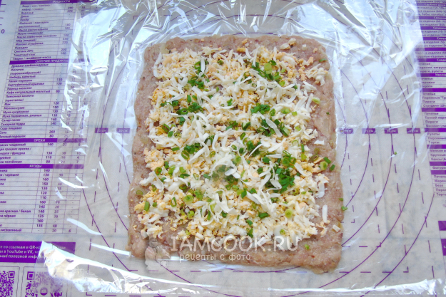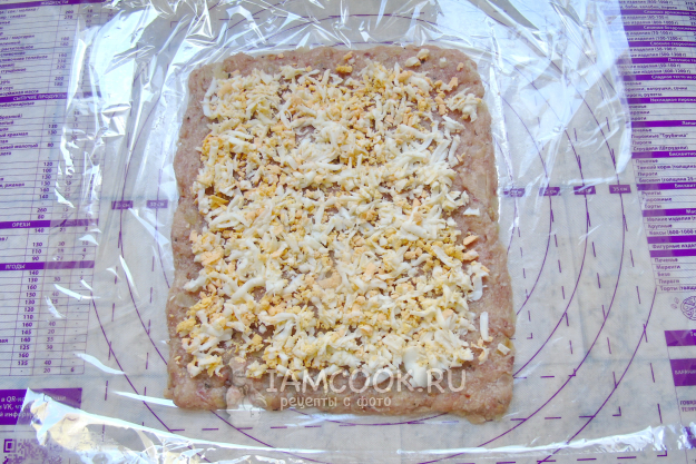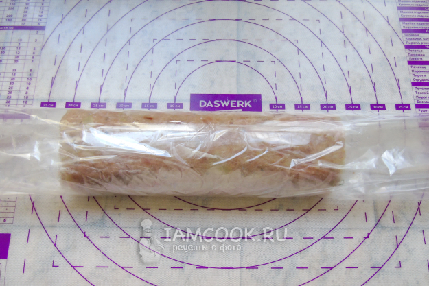 Помогая себе пищевой пленкой, сверните фарш с начинкой в рулет с узкой стороны.