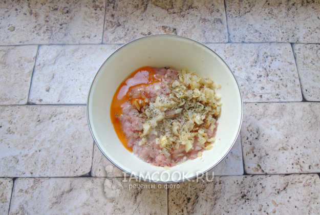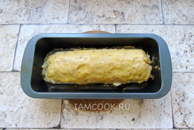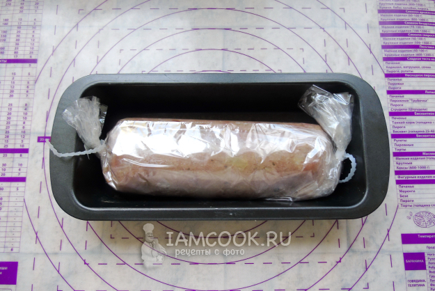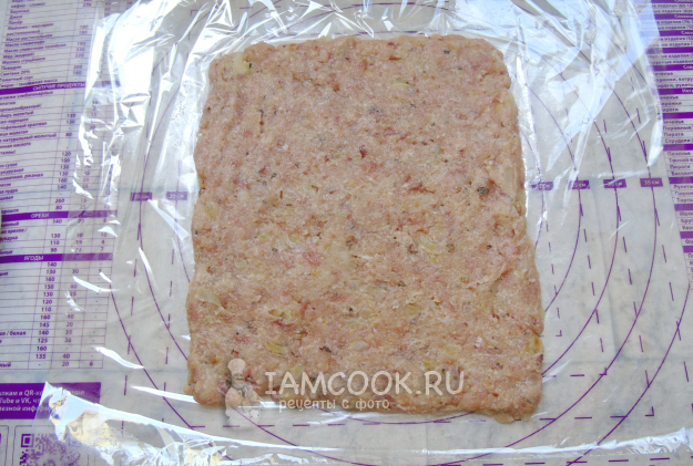 Приготовленный фарш разложите в виде прямоугольника на пищевой пленке или рукаве для запекания. Толщина слоя - приблизительно 8-9 мм.