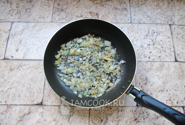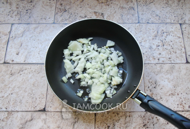 Репчатый лук мелко нарежьте и выложите на горячую сковороду с растительным маслом.