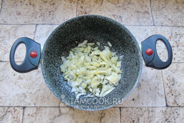 В кастрюлю с толстым дном или антипригарным покрытием налейте оливковое масло, нагрейте его. Выложите нарезанный лук и чеснок.