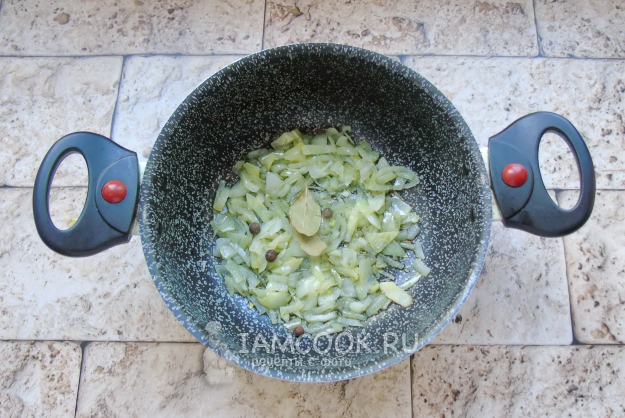 Тушите лук до прозрачности, после добавьте душистый перец и лавровый лист. Тушите еще 3 минуты.