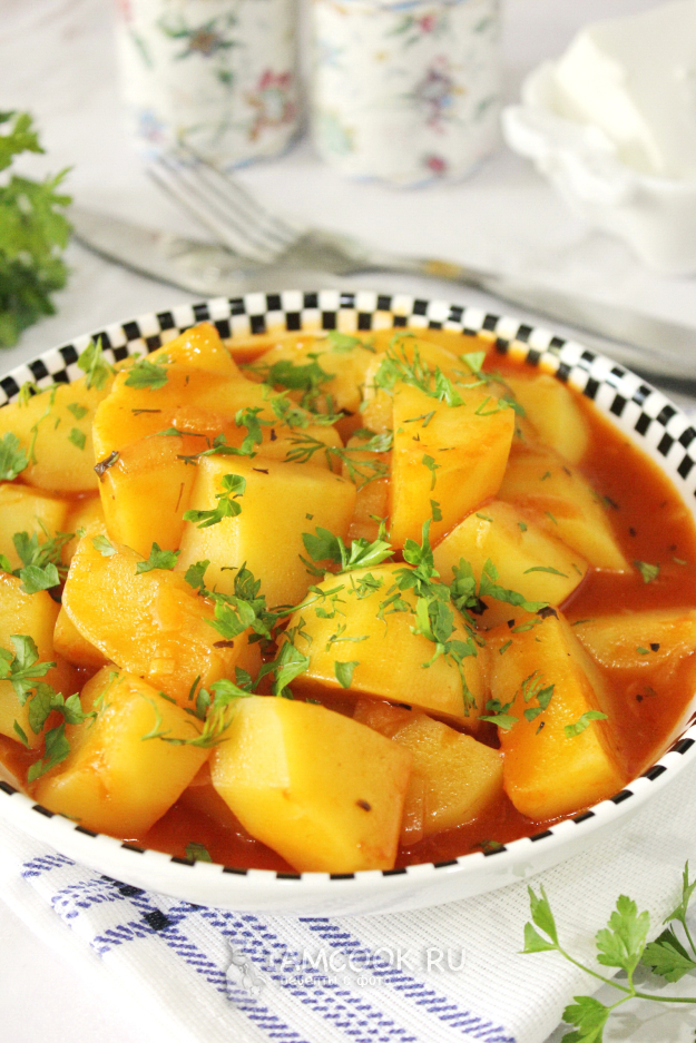 Тушеный картофель по-гречески готов. Подавайте с сыром Фета, зеленью и овощами.