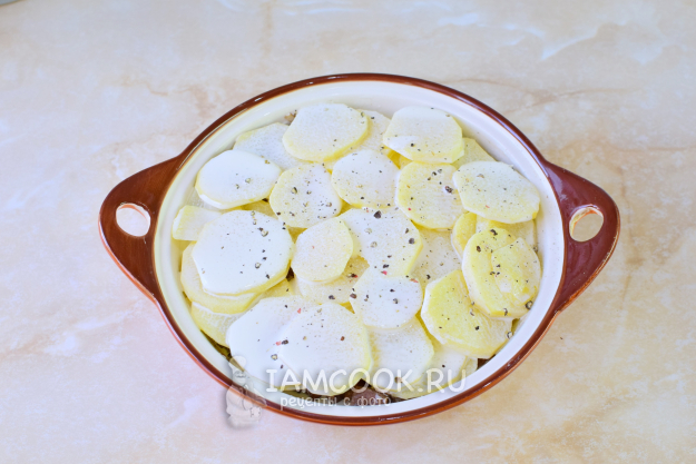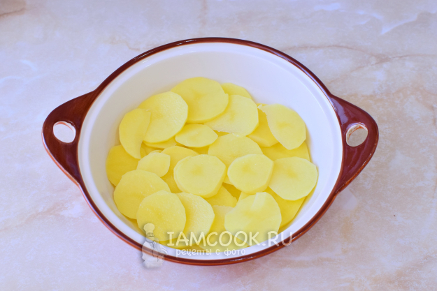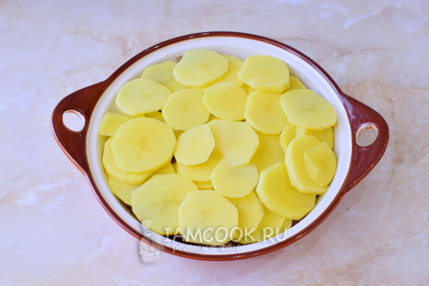 Подходящую форму для запекания смажьте растительным маслом и выложите картофель, нарезанный кружочками.