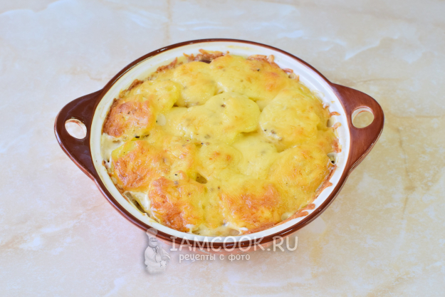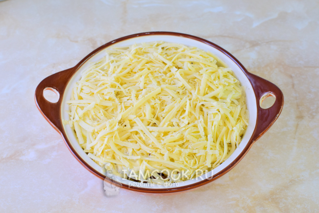 Сверху обильно посыпьте тёртым сыром. Поставьте форму в духовку, предварительно разогретую до 180 градусов, примерно на 40-50 минут. Ориентируйтесь по своей духовке.