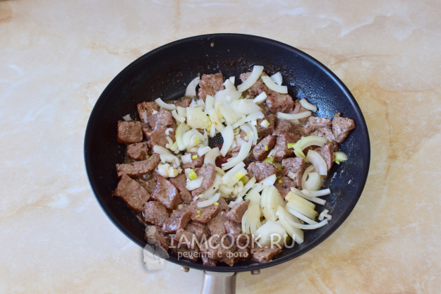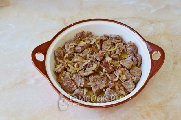 Затем выложите мясо с луком.