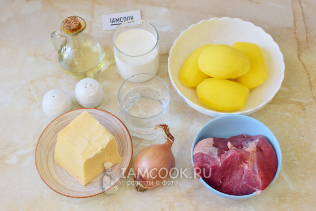 Чтобы приготовить картофельный гратен с говядиной, соберите необходимые ингредиенты по списку. Пропорции можно немного поменять на свой вкус. Сливки можно взять любой жирности.