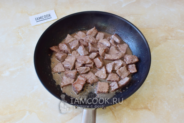 Говядину нарежьте на кусочки и обжарьте с добавлением растительного масла. Затем немного потушите под крышкой на небольшом огне. Молодое мясо достаточно потушить 20-30 минут. Ориентируйтесь по мягкости мяса. При необходимости можно подлить немного горячей воды.