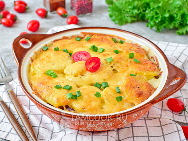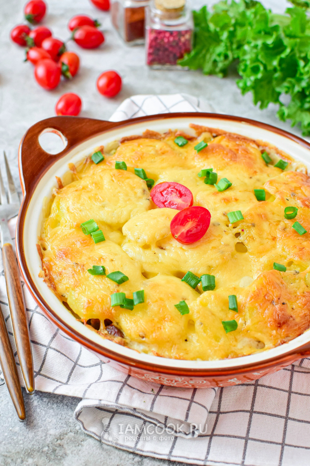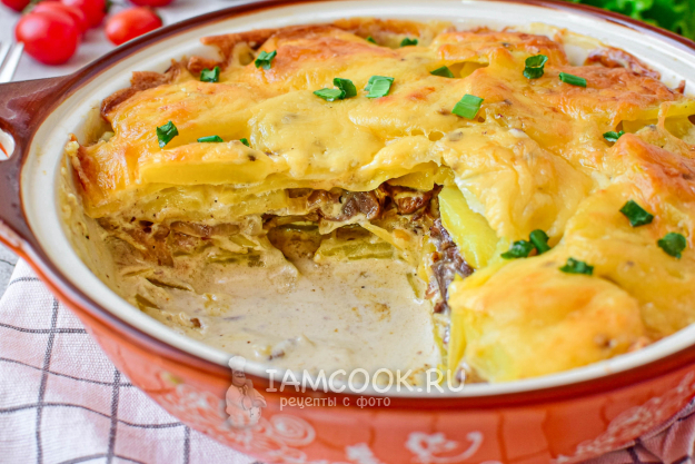 Готовый картофельный гратен с говядиной начнет сверху румяниться.