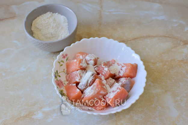 Рыбу отделите от костей и нарежьте на кусочки. Обваляйте кусочки в муке.