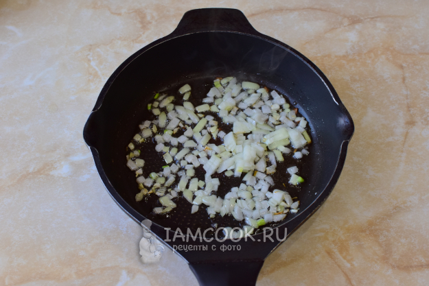 Лук очистите, мелко нарежьте и обжарьте 1-2 минуты.