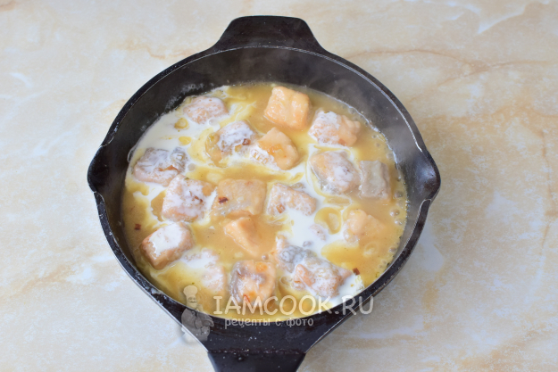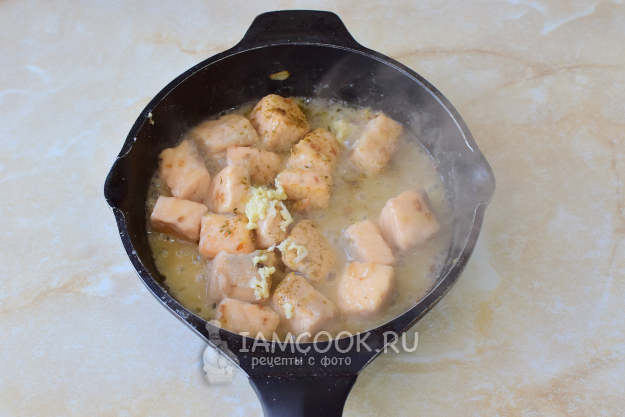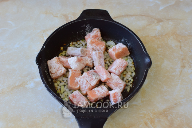 Затем выложите в сковороду кусочки рыбы. За 1-2 минуты обжарьте рыбу со всех сторон.