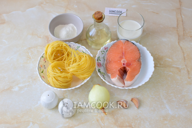 Чтобы приготовить тальятелле с лососем, соберите необходимые ингредиенты по списку.