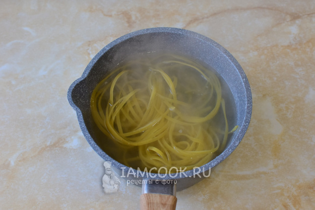 Пасту опустите в кипящую воду и варите до готовности согласно инструкции на упаковке. На это обычно уходит 5-8 минут. Паста станет мягкой и немного увеличится в размере. Откиньте её на дуршлаг и дайте стечь воде.