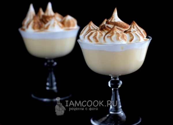 Выкладываем крем в кулинарный мешок и выдавливаем на пудинг. Можно сначала заполнить креманки, а затем делать узоры. Конечно можно сделать итальянскую и швейцарскую меренгу. Но я попробовала с обычных взбитых белков.