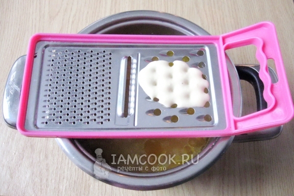 Когда овощи в бульоне будут готовы, делаем клецки. На кастрюлю кладем терку с крупными отверстиями. Столовой ложкой набираем тесто и выкладываем на терку. Водим ложкой по тесту и оно капает в кастрюлю с супом, мгновенно схватывается и превращается в маленькие клецки.