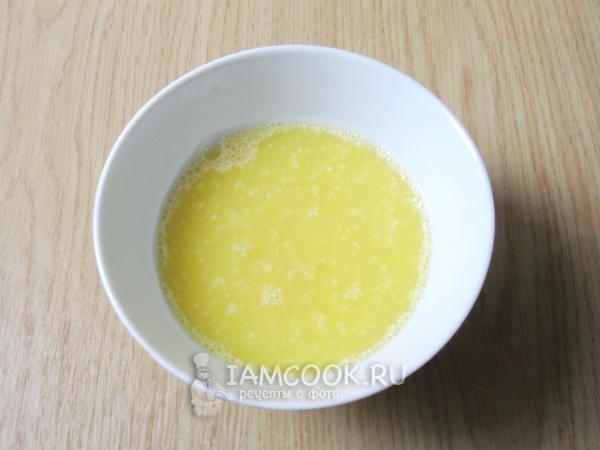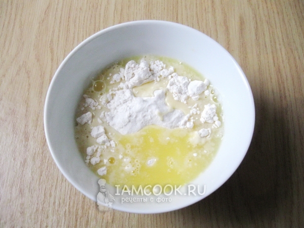 Затем насыпаем муку и перемешиваем так, чтобы не было комочков. Получаем не густое тесто, как на оладьи.