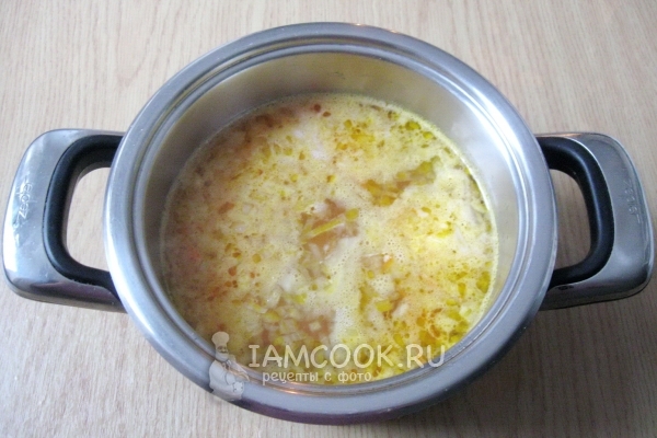 В кастрюлю наливаем любой мясной бульон. Картофель чистим, моем и нарезаем произвольно. Кладем в кастрюлю и ставим на плиту.