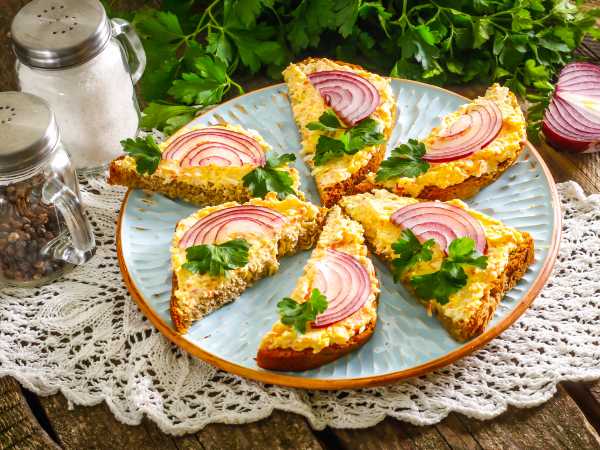 Репчатый лук тонко нарезать полукольцами и обжарить на сковороде до золотистого цвета, он готовится очень быстро. Готовый лук положить так же в середину бутерброда.