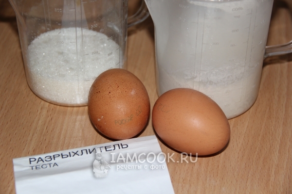 Подготовить продукты для приготовления бисквитного коржа. Яйца достать из холодильника за час до приготовления теста, чтобы они были комнатной температуры. Сахар и муку взвесить на кухонных весах или использовать мерные стаканы.