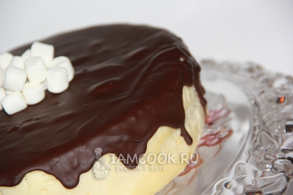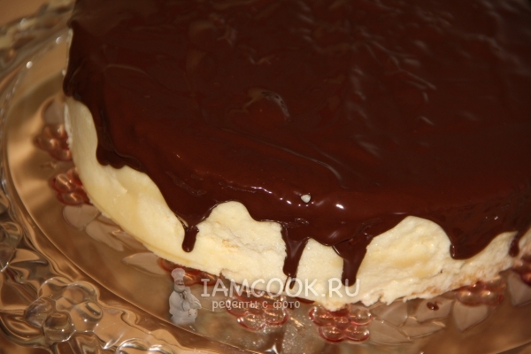 Полить верх торта растопленным шоколадом. Можно полностью покрыть торт шоколадом, а можно сформировать подтёки, чтобы было видно часть суфле.