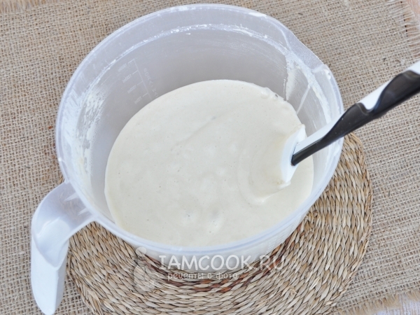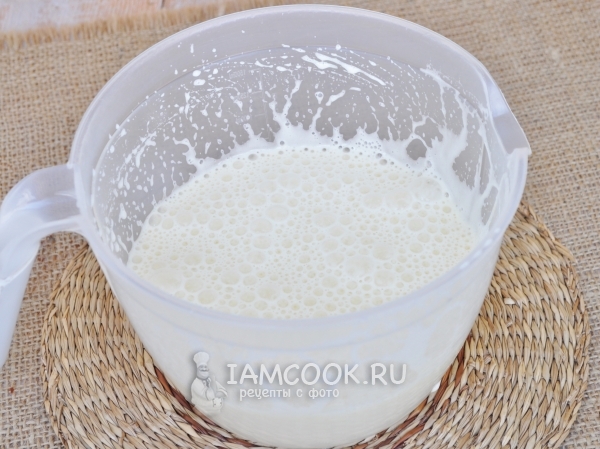 Яйца, масло растительное и сахар взбить миксером добела. При этом объём содержимого увеличится немножко.