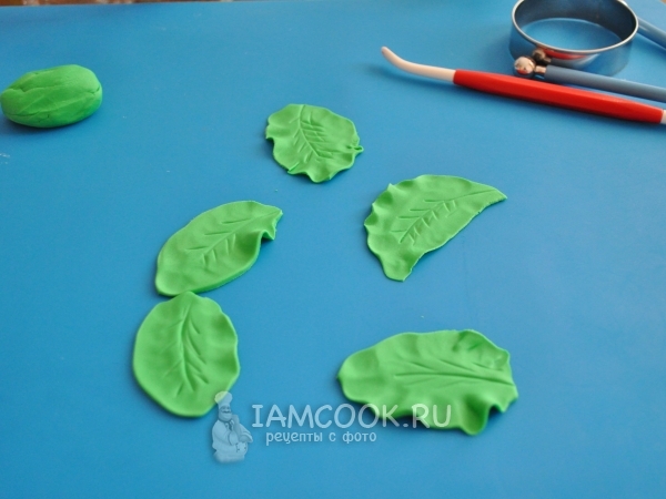 Для листиков у меня нет выемки и я делаю их вручную. Вырезаю листик, край растягиваю палочкой с шариком и изображаю прожилки на листе стекой.