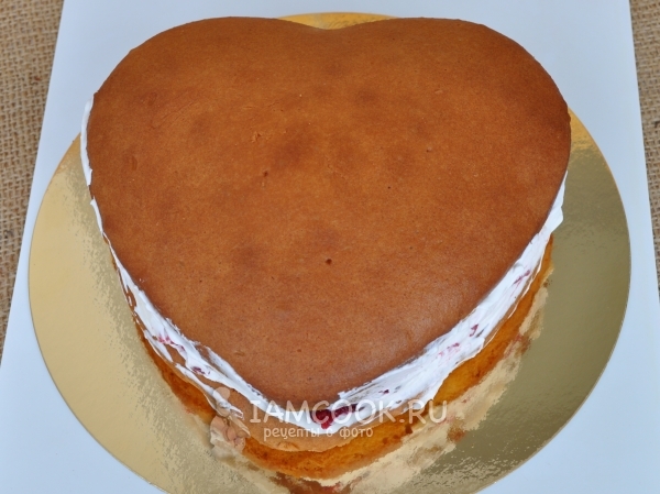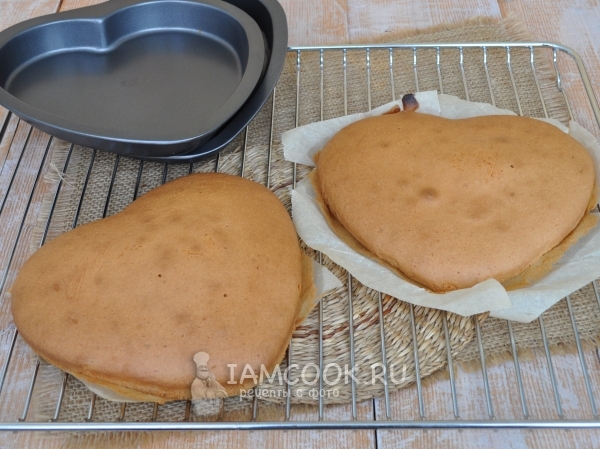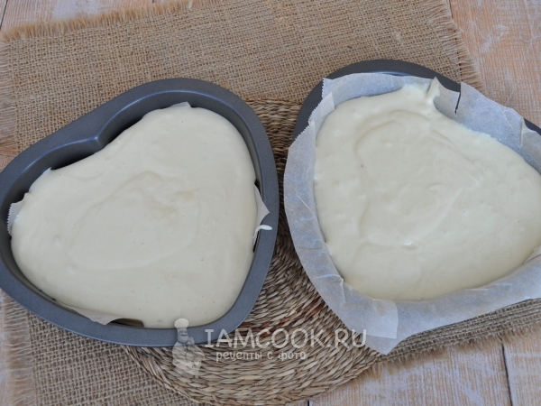 Готовое тесто залить в формы выстеленные пекарской бумагой и выпекать в разогретой духовке минут 15 -20 при температуре 200 градусов. До сухой лучинки. Для торта -клубнички подойдёт форма сердечка.
