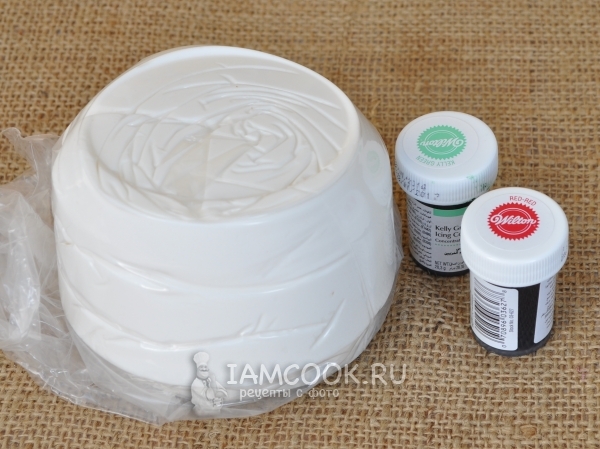 Большую часть мастики окрасим в красный цвет для обтяжки торта. Оставим маленький кусочек белого цвета для изготовления цветов. Кусочек немного больше окрасим в зелёный цвет для изготовления листьев и усов.