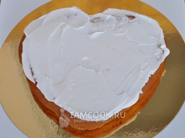 Для обмазки под мастику взбиваем масло сливочное комнатной температуры со сгущённым молоком комнатной температуры. В противном случае крем не будет пышным и однородным. Получаем пышный крем, которым покрываем со всех сторон наше сердечко и отправляем в холодильник для стабилизации минут на 30 можно и дольше.