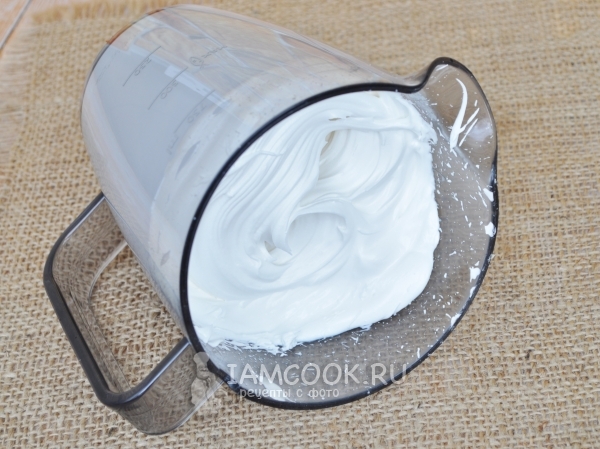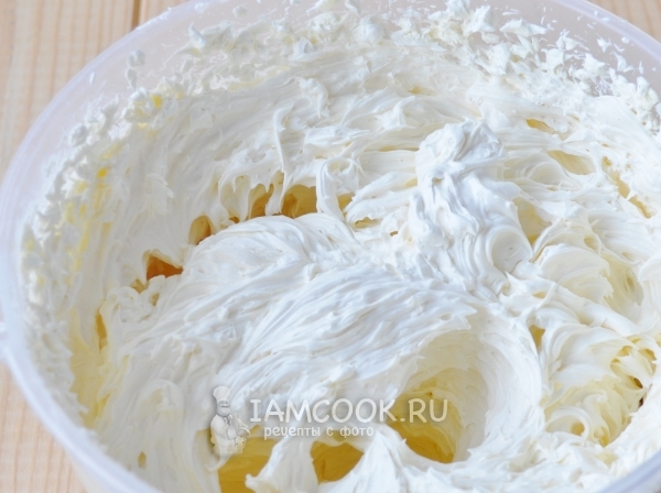 Взбиваем сливки до плотных пиков, а затем добавляем сгущёнку и продолжаем взбивать до вот такого состояния.