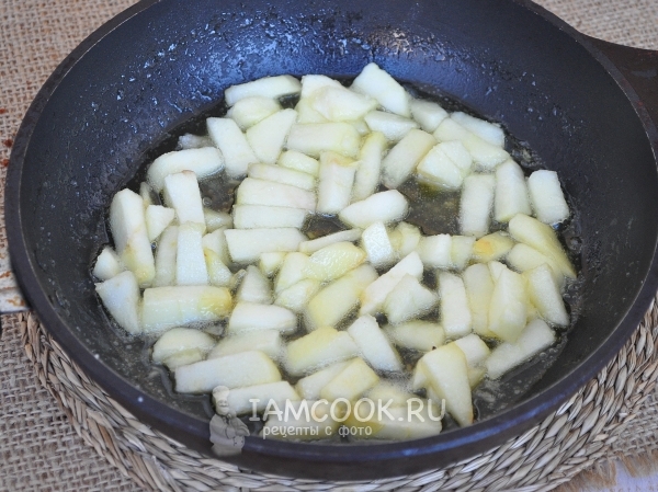 На сковороду выложим сахар и масло. Нарезанное яблоко потомим до мягкости. Учитывайте сорт яблок, кусочки не должны расползаться.