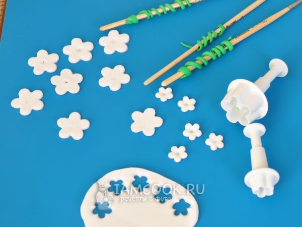 Из белой мастики плунжерами режем цветочки, из зелёной катаем тонкие жгутики и наматываем на кисти. Это будут усики клубники.
