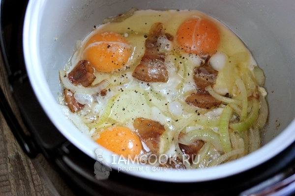 Разбейте на сало с луком куриные яйца, посолите их и поперчите по вкусу. Не забывайте - программа "Жарка " всё ещё включена.