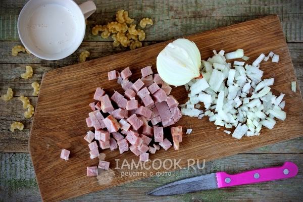 Приступим к приготовлению блюда с подготовки необходимых ингредиентов, а именно нам понадобится ветчина, лук, растительное масло, сливки, макароны, вода, соль, молотый перец, сливочное масло. Нарежьте лук и ветчину кубиками.