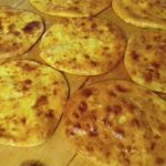 Делим его на две части. Из одной части раскатываем круг такого размера, чтоб внутрь поместился шар из сыра. По центру выкладываем сырный шар. Потом также готовим лепёшку из второй части теста.