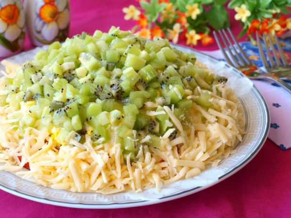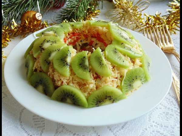 Оставшиеся киви нарезать дольками и разложить по верху салата. В центр нанести немного майонеза.