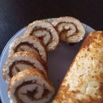 Горячий корж смазать повидлом, отделить от бумаги и свернуть в рулет. Смазывать и сворачивать рулет нужно именно горячим, потому что как только он начнет остывать, бисквит станет ломким.