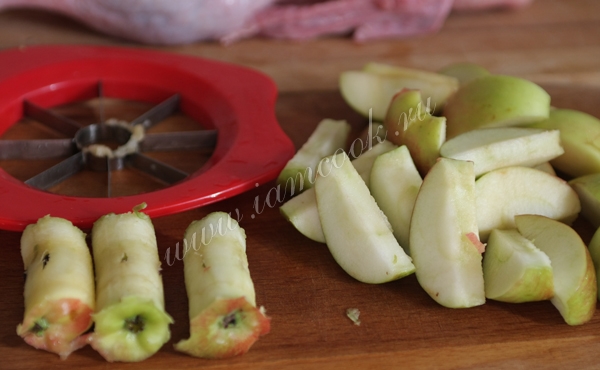 Яблоки очистить, но шкуру не обдирать - так будет вкуснее. Затем плотно набить ими внутреннее пространство тушки утки.