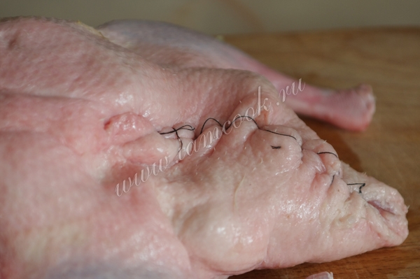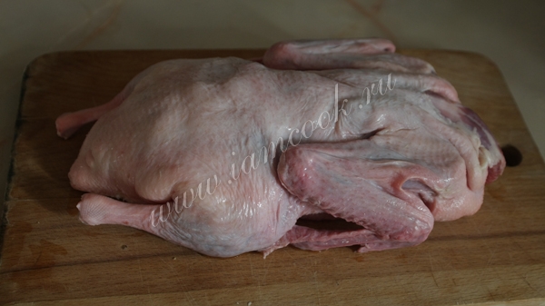 Утку вымыть под струей прохладной воды, обсушить сверху бумажными полотенцами и положить на доску.