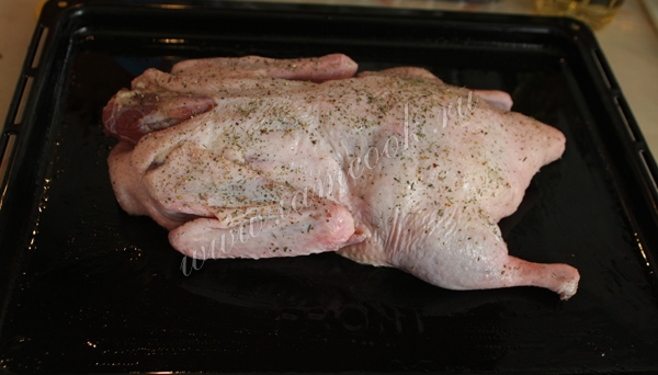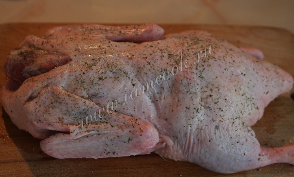 Тушку утки натереть солью и черным перцем. Я лично добавляю еще и другие приправы, например хмели-сунели, а также сушеную зелень.