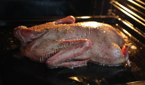 Утку выложить на противень и отправить в духовку на 1.5 - 2 часа. Периодически посматривать за ней, чтобы не подгорела.