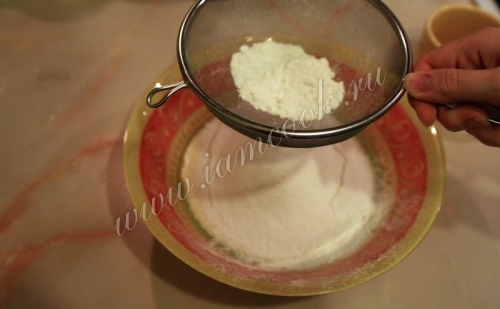 Муку просеять через сито, добавить в блюдо, хорошенько перемешать.