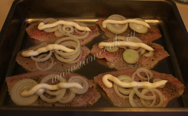 На каждый кусочек филе рыбы выложим лук и сделаем полоску из майонеза.