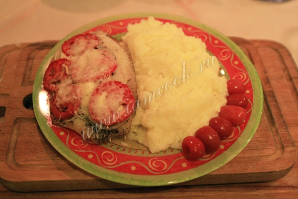 Через 10 минут достаем блюдо из духовки, выкладываем на тарелку и подаем с любым подходящим гарниром. У меня сегодня по расписанию картошка пюре и маринованные томаты черри.
